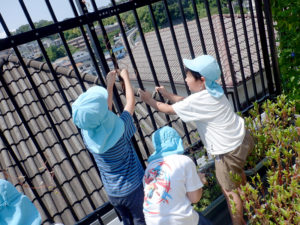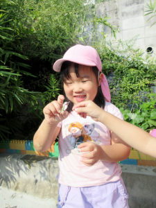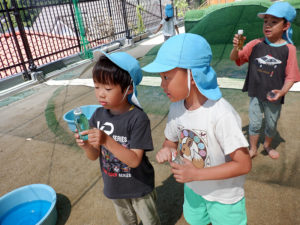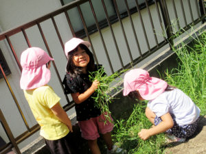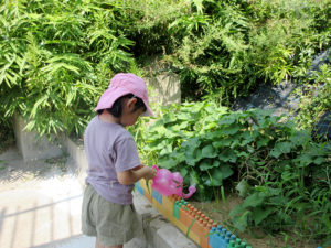 暑い中頑張って畑までさつま芋の水やりに行っている子どもたち。「暑いから(いや)」「虫に刺されるから(行かない)」と言いながらも畑に着くと生い茂っている葉をめくり土に届くように水やりをしたり、「草、抜いとくで」と言いながら雑草を抜き、するべきことがよくわかっている子ども達。畑ではいろいろな虫やお花を見つけることも楽しみの一つのようです。ひまわりのように大きな生長はわからなくても土の下のさつま芋はきっとおおきくなっているのではないでしょうか。収穫を楽しみにこれからもお世話をしていきたいと思います。