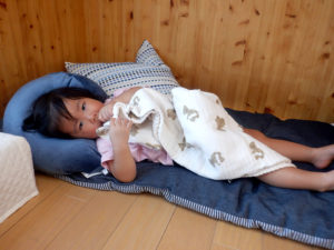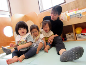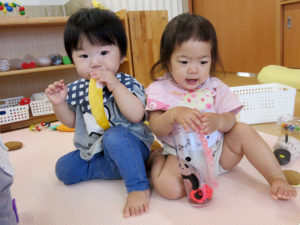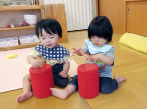 お友達の事が気になるようで、同じ遊びをする事が増えました。太鼓を叩いていると必ずといっていい程、誰かが一緒に叩き始めます。押し箱に入っていると押してあげたり、時には一緒に入って『狭い~』とトラブルになったり…。保育者の膝に座って遊んでいてもすぐに誰かがやって来るので膝の上は大人気です。違う遊びをしていても自然と友達のすぐ隣にいる事もしばしば。一緒にいると「面白いね」「楽しいね」と感じて、友達と遊ぶ心地良さを知ってくれればと思います♡