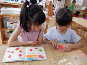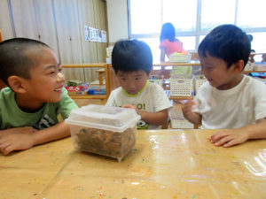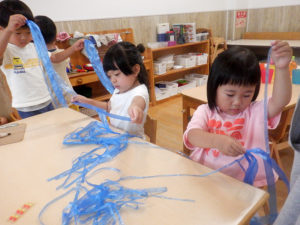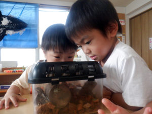 きく、たんぽぽ組のお兄ちゃん、お姉ちゃんと一緒に水遊びやプール遊びで涼みながら夏を過ごしてきました。チームの友達と過ごす中で「映画館ごっこしよう」「水族館作りたい」「お祭りしたいね」などそれぞれのチームで出てきた意見をもとに話し合ったり作ったりする中で参加しながら楽しく過ごしました。クラスでの活動ではスズランテープを割いて水に見立てて遊んで楽しんだり、友達が連れて来た虫に興味津々で、観察を楽しんだりと色んな遊びを楽しみました。9月からはクラスで過ごしますが、運動会はお兄ちゃんお姉ちゃんと一緒に楽しみたいと思います。