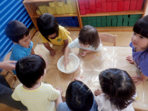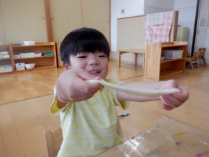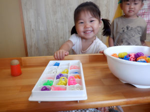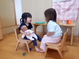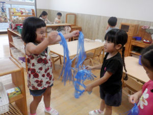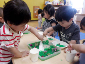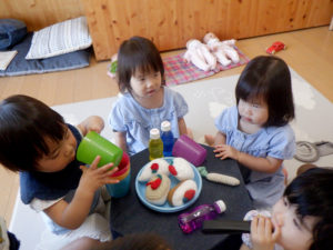 ごっこあそび・見立てあそびがどんどん本格的になってきました。以前までは、友達とごっこ遊びをしても、2人で同じ役をしている事が多かったのですが、お医者さんと患者さん、店員さんとお客さんなど役柄を分けて遊びに入り込むことが出来るようになり、台詞も本格的になり遊びが盛り上がってきています。感触あそびや指先遊びなども、子ども達は楽しそうな声を出しながらイメージしているものを作り上げる事が出来るようになりました!今後も楽しい活動をしていきたいと思います♪