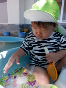 この夏は特別暑かったですね💦そんな暑い日々を少しでも涼を感じながら遊べるようにと、すみれ組では様々な「冷たっ‼」となる水や氷、寒天遊びを子どもたちと一緒に楽しんでみました。氷の中には可愛い彩り豊かなお花が入っていたり、寒天遊びでは初めての感触にみんな驚いた表情を見せていました♪お盆の頃にはお部屋の中が大変身!手先を使って遊ぶ玩具が増えたり、ゆったりできるスペースも設けて子ども達は探索活動に夢中です😄