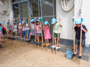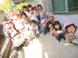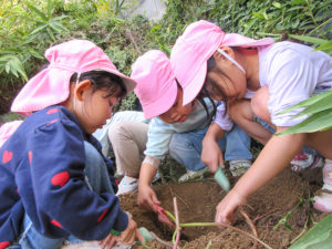 しおやっこカーニバルでは様々なことを経験し、緊張したりできるようになったことが自信となったりたくさんの成長を見せてくれたきく組。温かい応援をありがとうございました。10月末には春に苗を植え生長を楽しみにしてきたさつま芋を収穫しました。10月の月刊絵本のお芋3人組から「どっしりさんかな?」「これはころりさん」とお話に繋げて楽しみながら掘っていました。収穫までを通して植物の生長過程を楽しめ良い経験となりました。これからも子どもたちの興味関心に寄り添いながら遊びを見守っていきたいと思います。