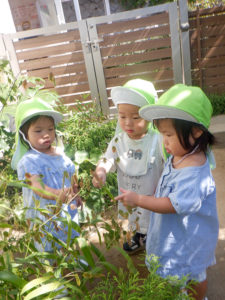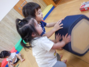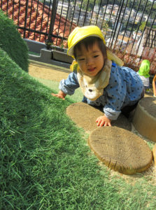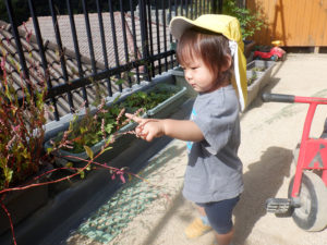暑い夏が終わって、お外で遊べるようになりました。大人気の遊具は、芝山からもネットの坂からも上って行きます。丸太の坂は難易度が高いのですが、果敢に挑戦する子も。コンビカーを押せるようになったり、四輪車をこげるようになったり、できることが沢山増えました。チョウチョを見つけて追い掛け、花壇の植物に興味を示し、園庭を動き回って探索活動も楽しんでいます。全力で遊ぶ子ども達の笑顔が園庭に溢れています!