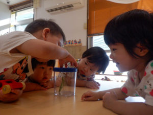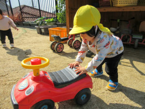お友達の「おいで~」の言葉に誘われるようにして戸外に跳び出していく子どもたち。「○○くん」「○○ちゃん」とお友達の名前を呼んだり、お友達が遊んでいるのにも興味を持って保育者に教えてくれます。お友達と同じ玩具で遊んでいても遊び方は十人十色。そのうちにお友達の遊びを見て面白いなと思ったら真似っこをしてみます。その中で「どうぞ!」と物の貸し借りや「(一緒に)しーよーお!」と心を通わせた関わりが少しずつ持てるようになってきた子どもたちです。