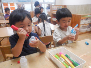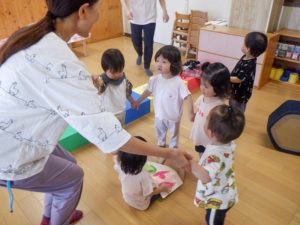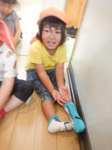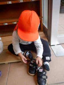 衣服の着脱や身の回りのことなど「ジブンで!」と意欲的に取り組もうとする姿が多く見られています。靴下を脱ぐ履くことに加え、裏返しになった靴下を自分で表に直したり、脱いだ後にクルっとひとまとめにしてから片付けています。また、最近は「お兄さん(お姉さん)パンツ履く」と言い挑戦する子も出てきています。「ジブンで!」という気持ち、一人一人の思いを大切にしながら挑戦していきたいと思います。