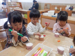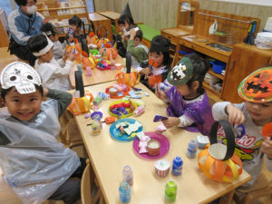 しおやっこカーニバルでは初めての雰囲気に緊張しながらも頑張った子どもたち!お兄ちゃんお姉ちゃんと力を合わせて異年齢競技も頑張りました!しおやっこカーニバルの裏側ではハロウィンパーティーに向けての準備を少しずつ楽しんでいました。それぞれ何になりたいのか考えながら、ジュースや飴、カップケーキなど作りながら楽しみにしていました♪10月31日は待ちに待ったハロウィンパーティー仮装して、机にお菓子を並べて「カンパーイ」と作ったジュースを飲んだりお菓子を食べたり、お化けになりきったり♪色んな部屋で「トリックオアトリート!」と言って、沢山お菓子をもらい嬉しそうな子どもたちでした。